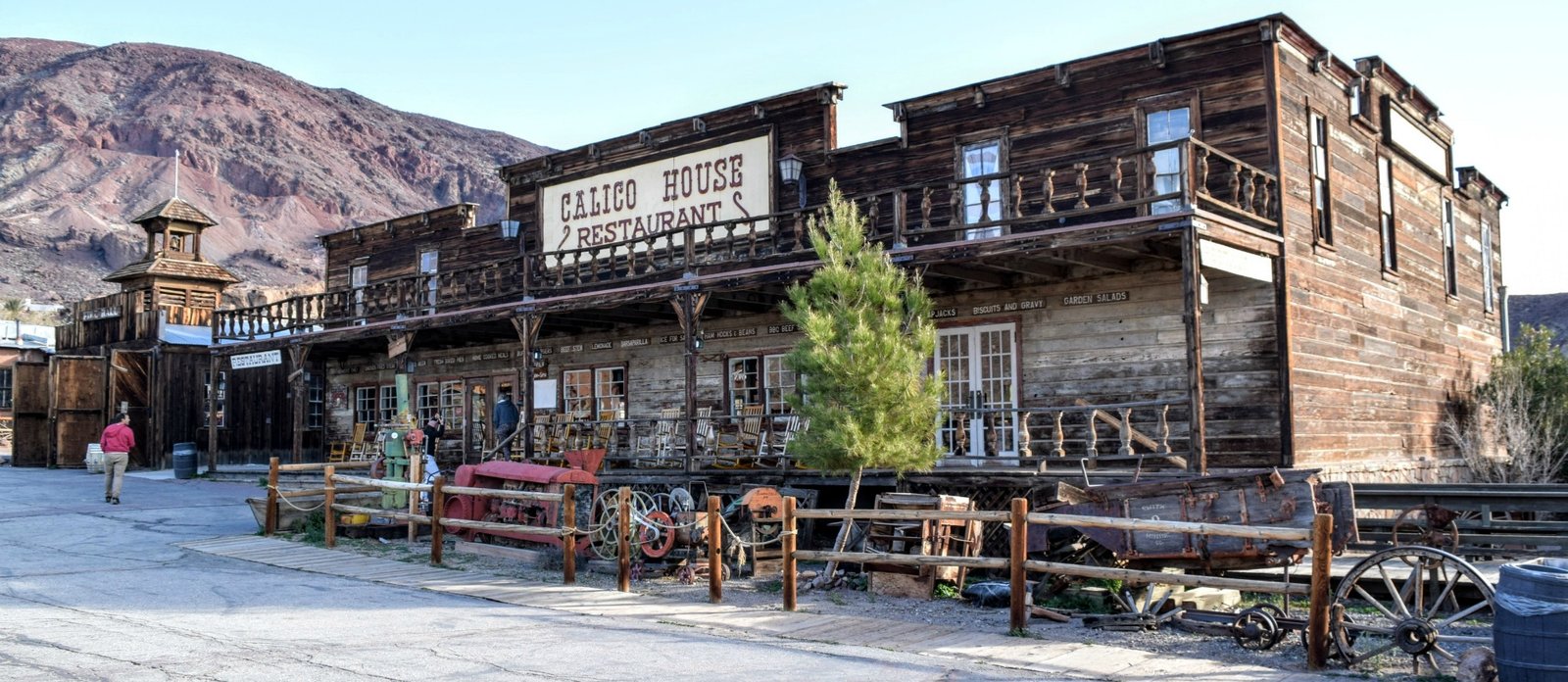 Calico has been restored to the look of the silver rush era when it flourished, although many original buildings were removed and replaced instead with gingerbread architecture and false facades that tourists would expect to see in a Western-themed town; Most of the restored and newly built buildings are made of wood with a simple, rustic architecture and a severely weathered appearance. Some structures still stand dating back to the town’s operational years: Lil’s Saloon; the town office; the former home of Lucy Lane, which is now the main museum but was originally the town’s post office and courthouse; Smitty’s Gallery; the general store; and Joe’s Saloon. There is also a replica of the schoolhouse on the site of the original building. The one-time homes of the town’s Chinese citizens exist as ruins only; only a portion of one rock wall remains of the former “family” residential area on a nearby bluff.