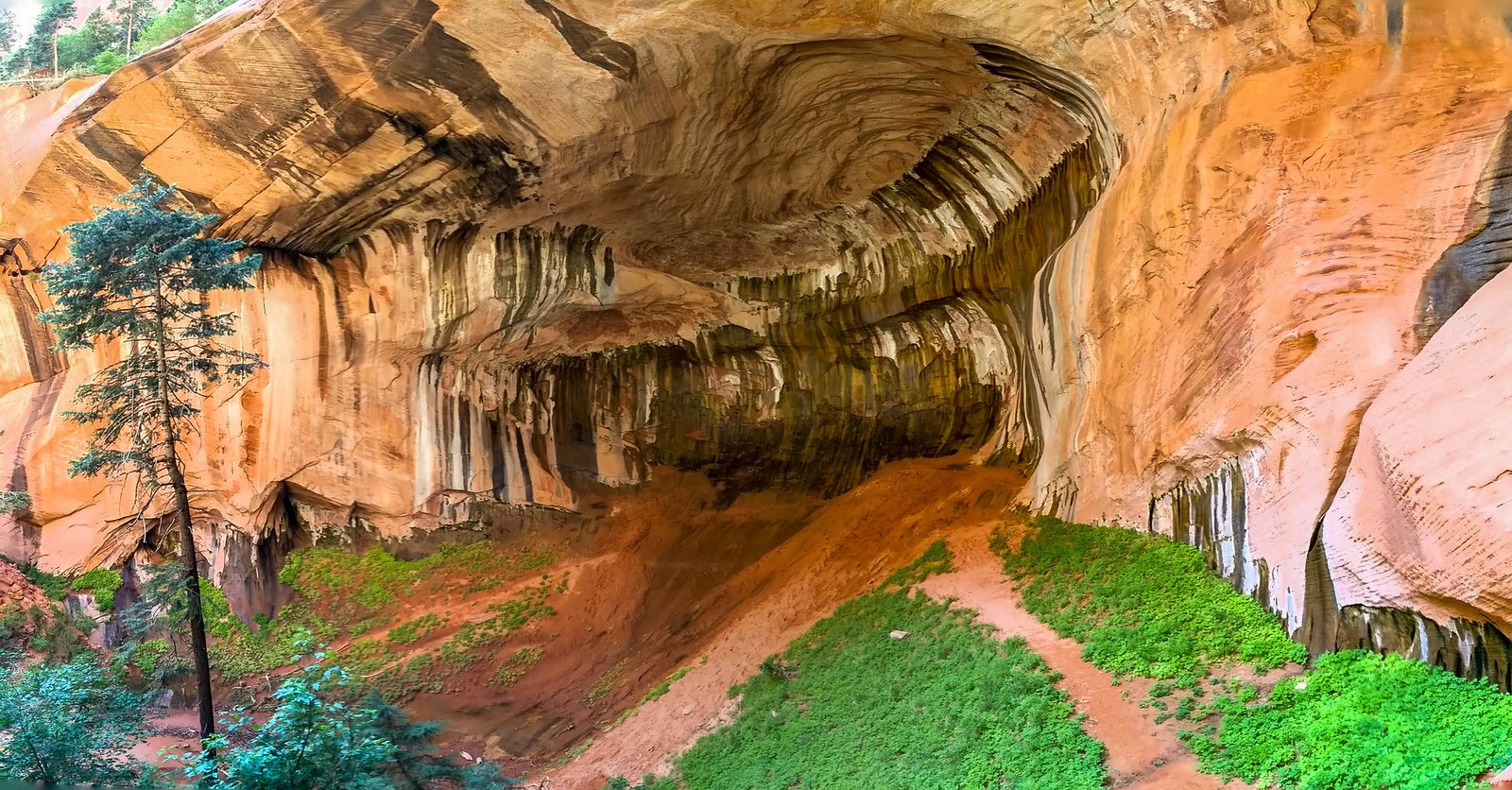 The main section of the trail ends at Double Arch, that’s not actually an arch but a large colorful alcove. (banner photo above) The alcove is a very deep like what you might see at Mesa Verde National Park where the Ancestral Puebloans might built their cliff dwellings, although the slope below is much steeper.
